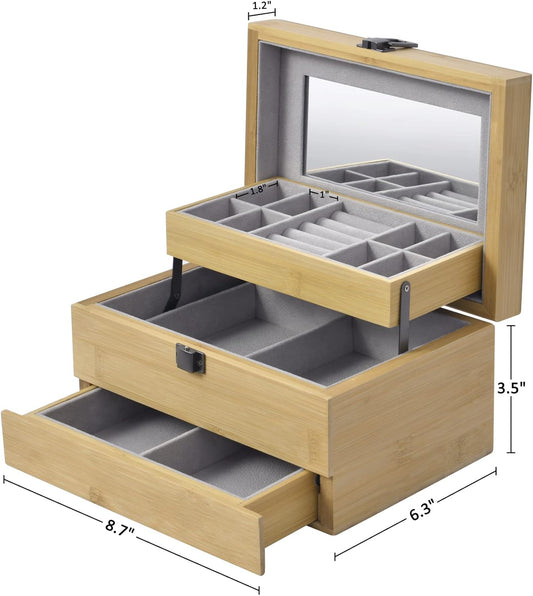 Three-Layer Bamboo Jewelry Box with Mirror Jewelry Storage with Lock Jewelry Organizer with 2 Drawers for Girl Women'S Gift Mother'S Day